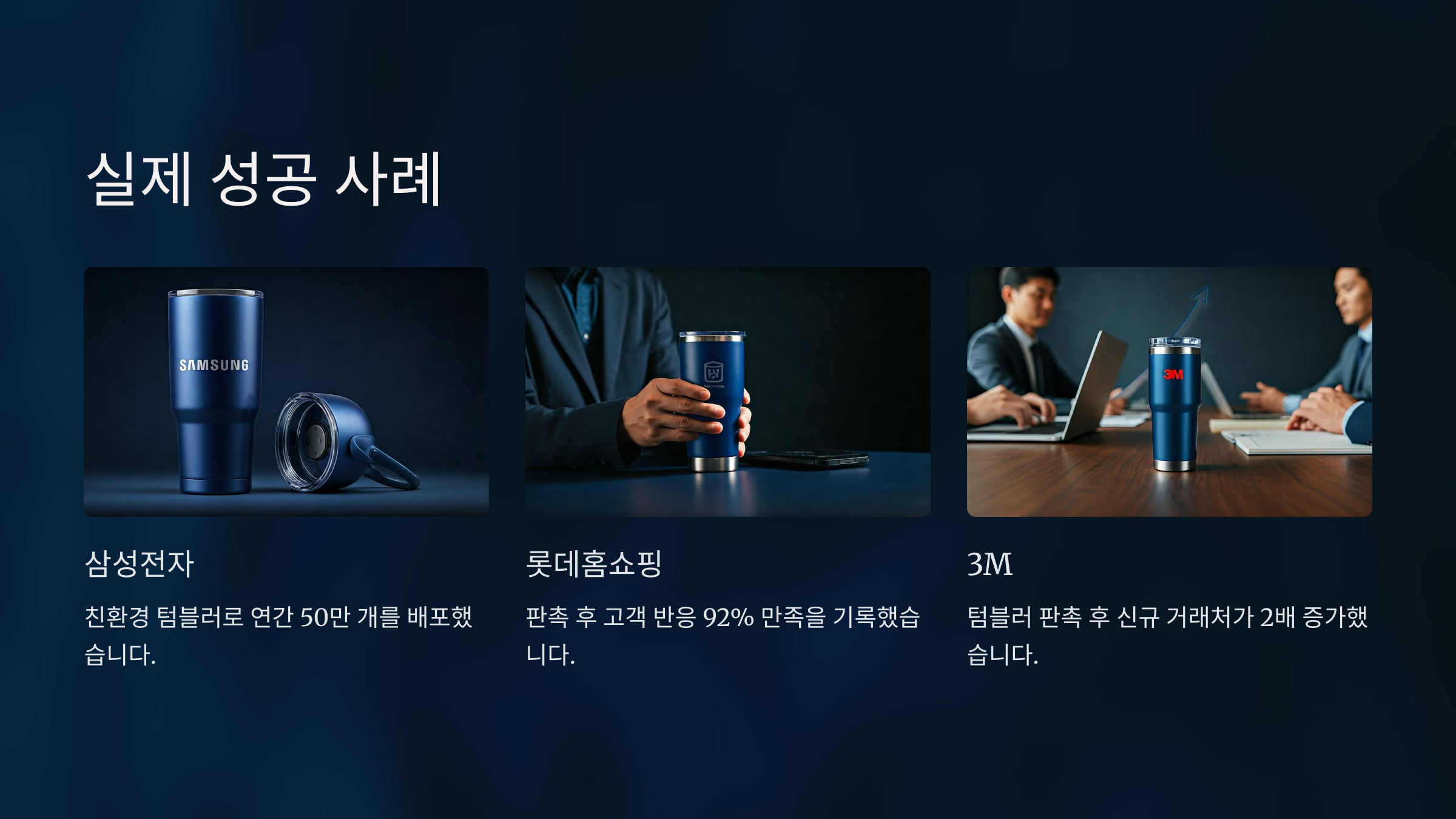 캠페인 기간 동안 환경 프로그램 참여율이 전년 대비 60% 증가했고, 참가자들의 환경 보호 실천 의지도 크게 향상되었습니다. 특히 판촉물 자체가 환경 보호 메시지를 담고 있어 교육적 효과도 컸습니다.